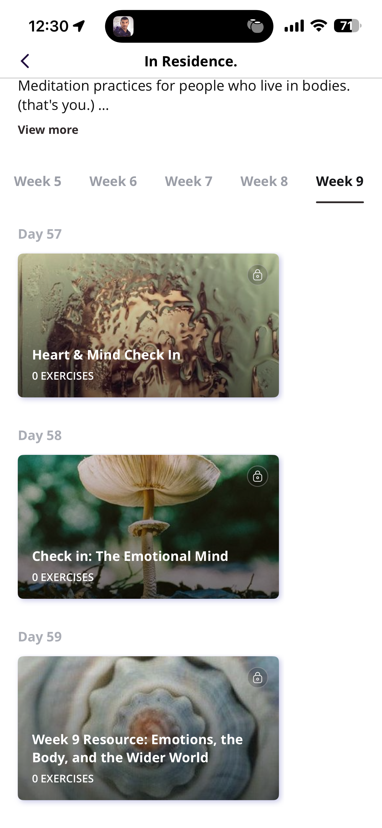 Day 3 each week offers a curated reading, video, or article from a voice outside this program. The aim is to help you see the week's theme in a wider context (not just yoga, not just meditation, but the real world too). Past resources have included everything from neuroscience explainers on interoception to poetry by Maggie Smith to excerpts from lectures by Erika Huggins. You don't have to engage with it, but most people find it's the day that surprises them the most. It takes about 15–20 minutes including the reflection.